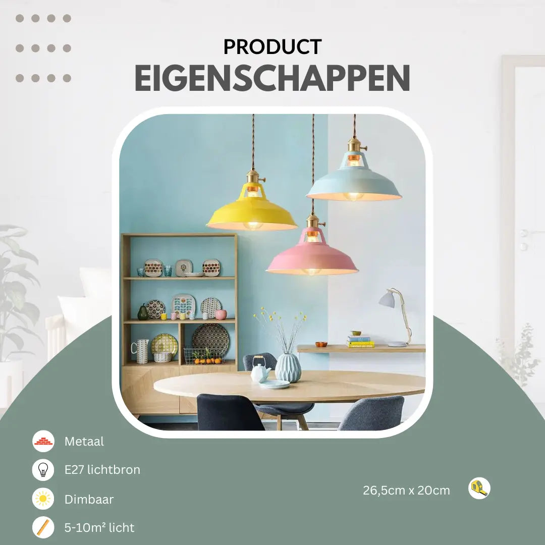 This retro pendant lamp with its colored metal shade adds a playful and unique touch to any room. Choose from seven vibrant colors to brighten up your interior and emphasize your individual style. Perfect above the dining table, bar, children's room, or in a creative workspace. The design is inspired by vintage shapes and finished with a durable lacquer. Combine multiple lamps for a playful effect or choose a single color to make a statement.
