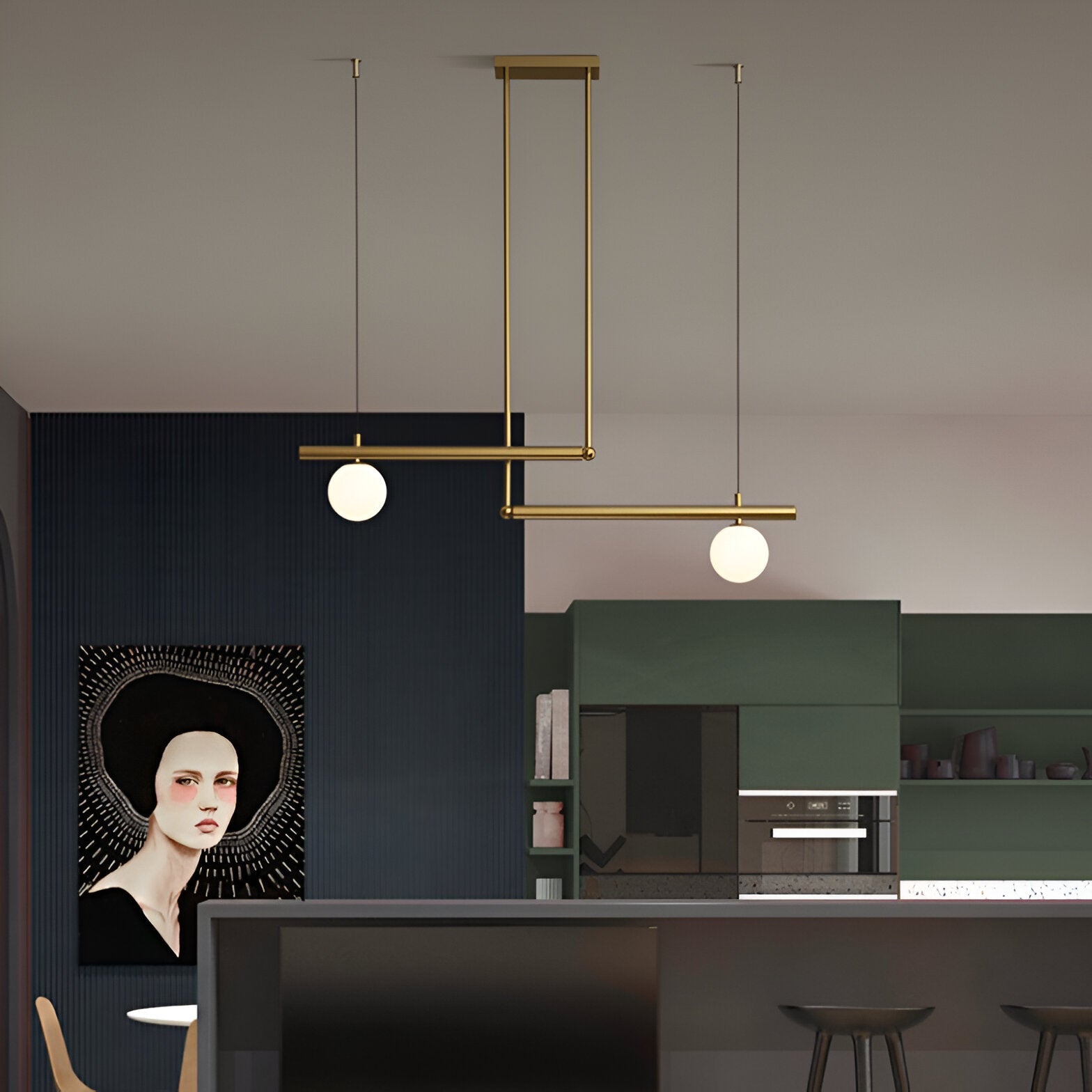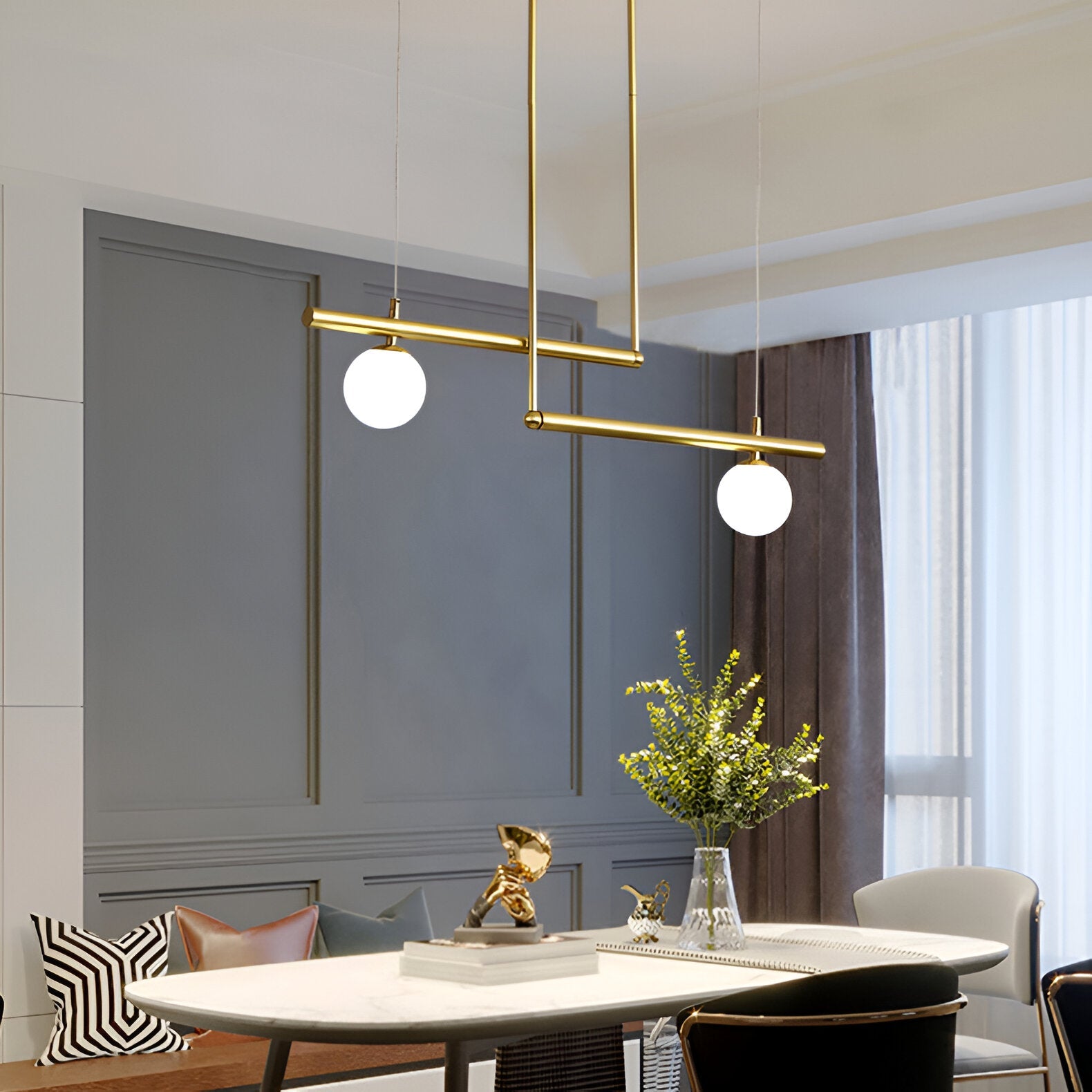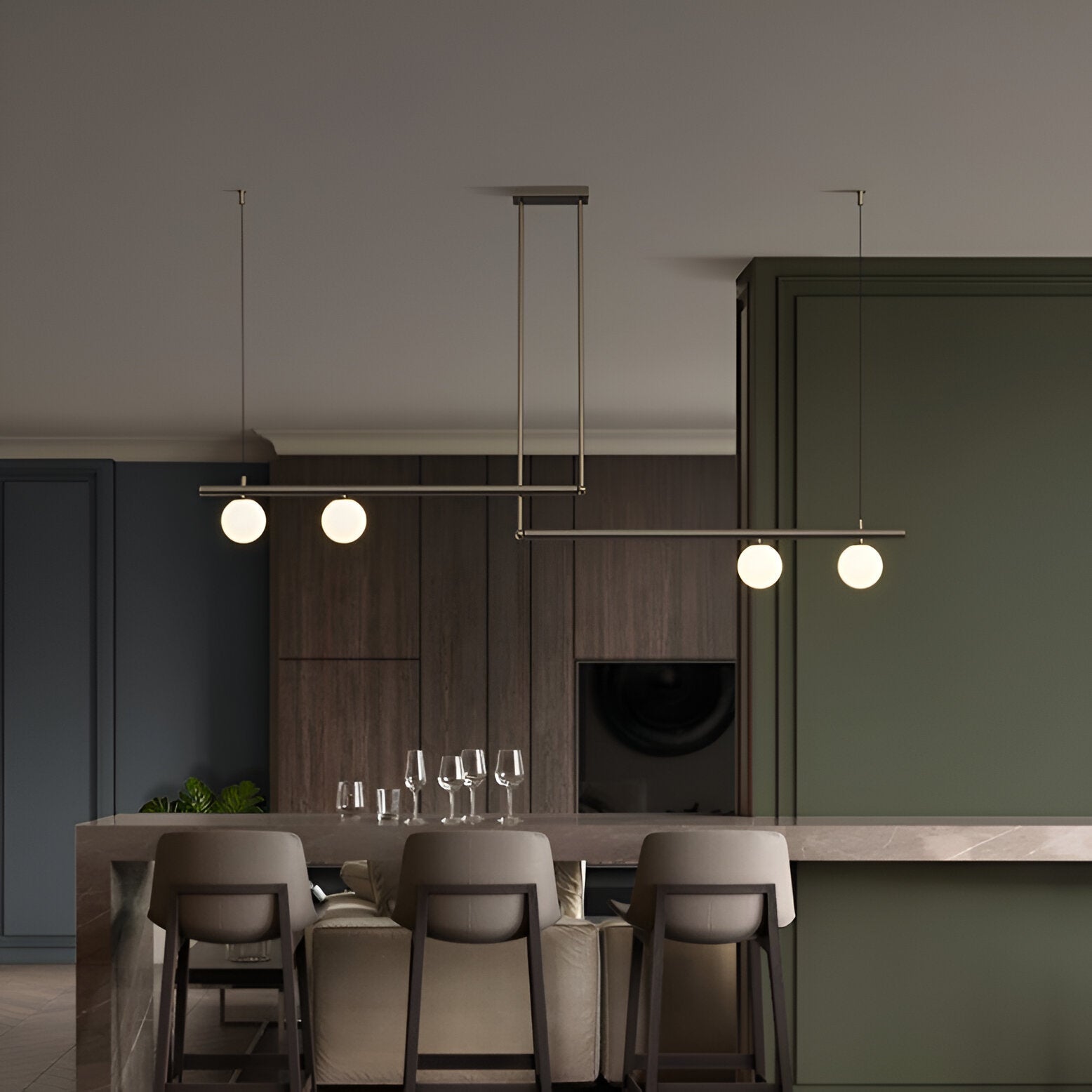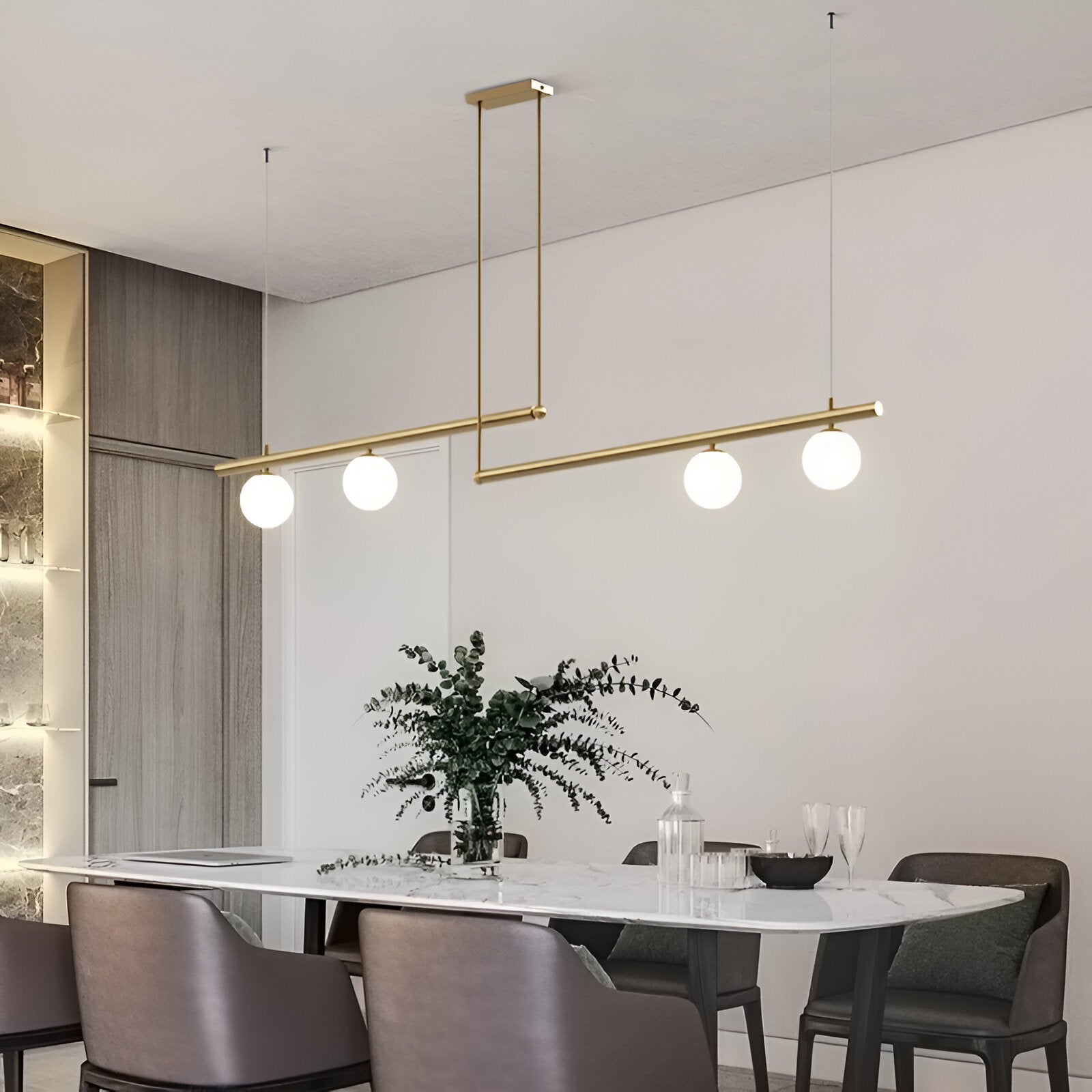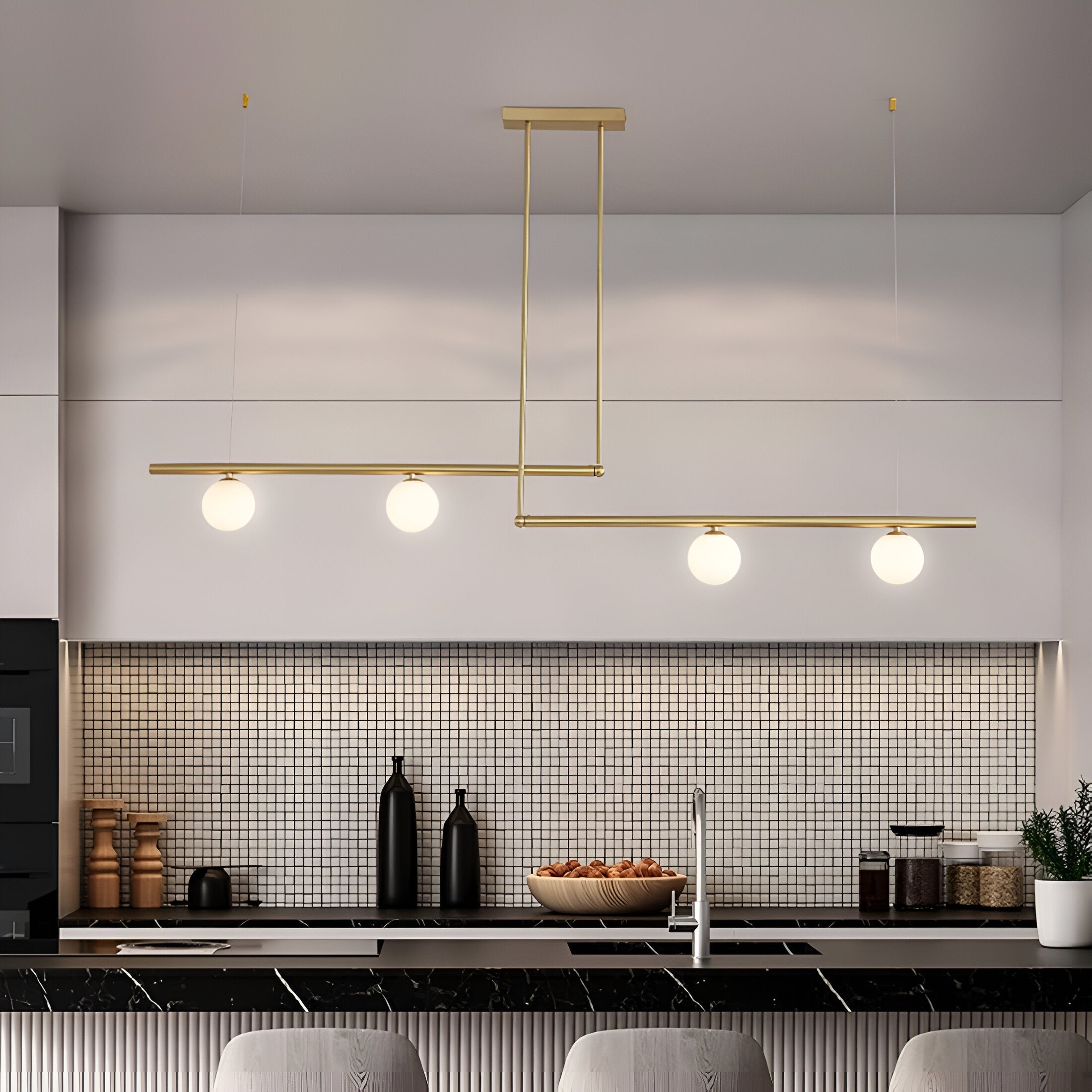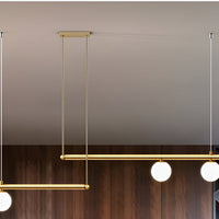 De Altana hanglamp brengt balans en elegantie met zijn horizontale opstelling van geribbeld glas en metalen accenten. Het slanke ontwerp is perfect boven een eettafel, keukeneiland of vergadertafel en verspreidt een helder maar sfeervol licht. Dankzij de combinatie van luxe materialen en een minimalistische vormgeving past deze lamp moeiteloos in moderne, Scandinavische of industriële interieurs.