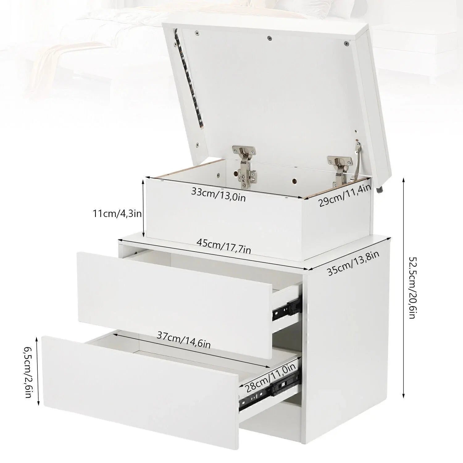 De Lumora is een stijlvol wit nachtkastje met vierzijdige hoogglans afwerking, twee lades (waarvan één bovendeur) en instelbare RGB LED-verlichting. Perfect als blikvanger én functioneel meubel in de slaapkamer.