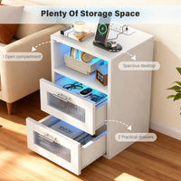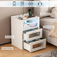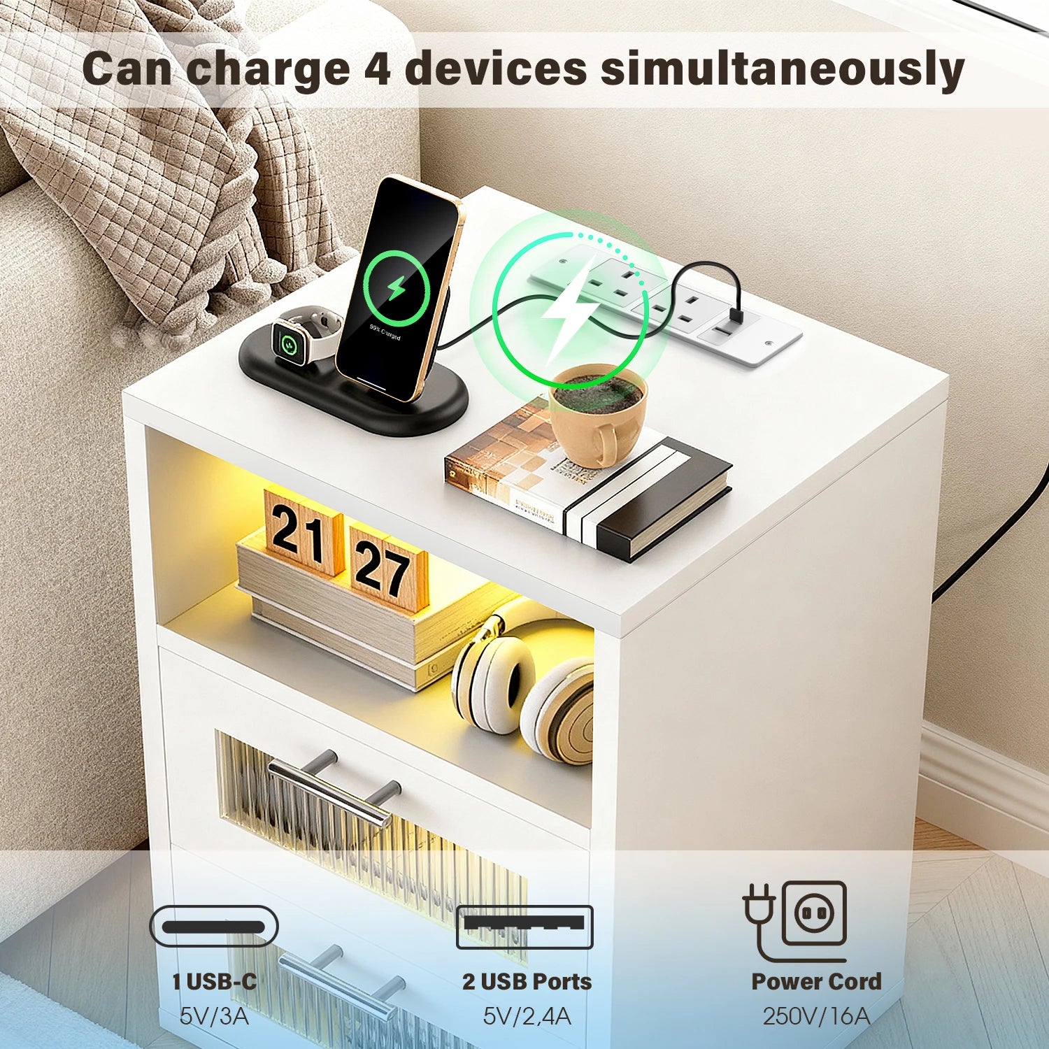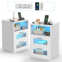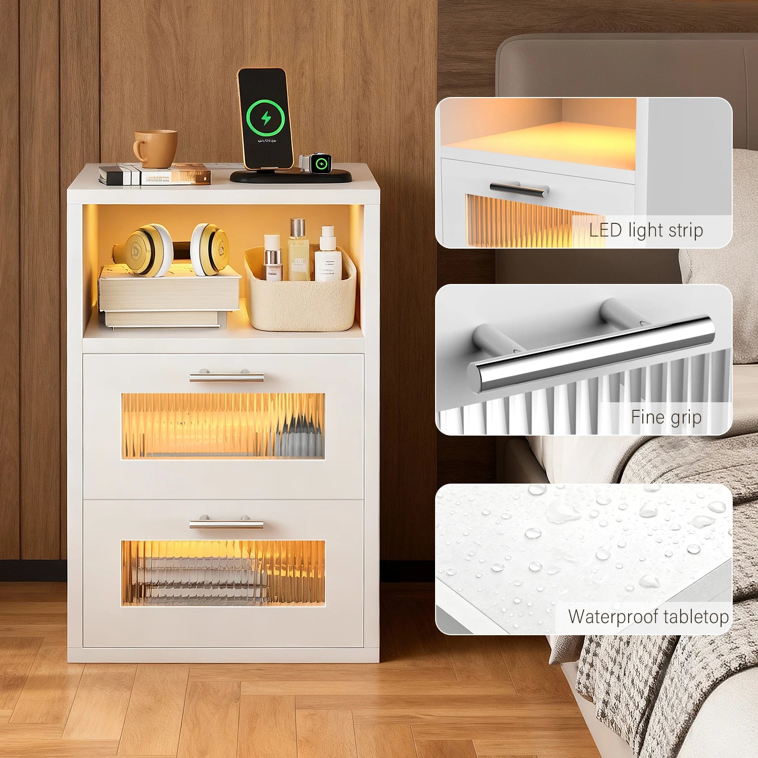 Breng stijl en gemak samen met de Noctura nachtkast. Dit nachtkastje beschikt over twee lades voor praktische opbergruimte, een geïntegreerd oplaadstation voor je apparaten en sfeervolle LED-verlichting die je kamer een moderne uitstraling geeft. Verkrijgbaar in zwart of wit.