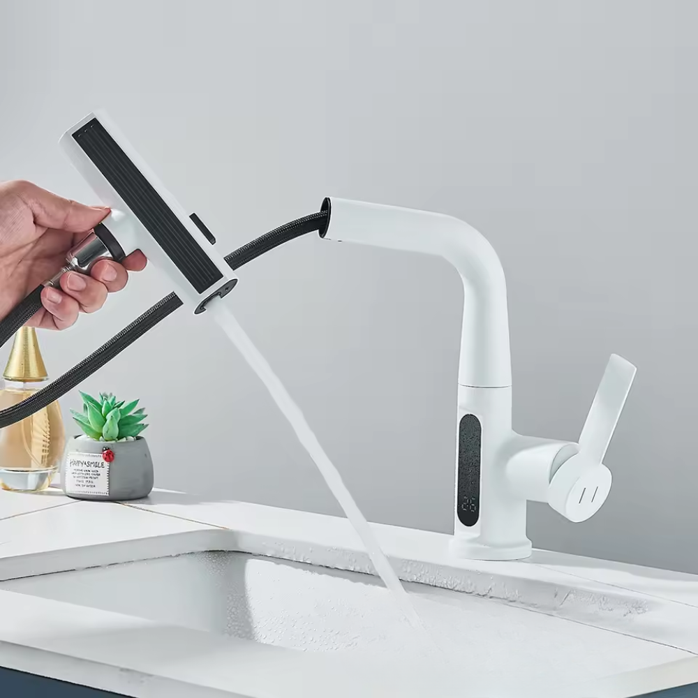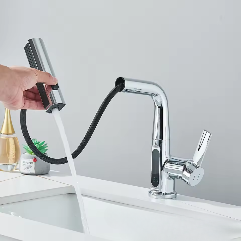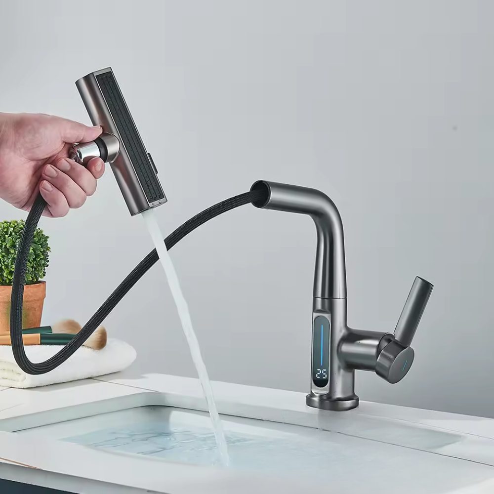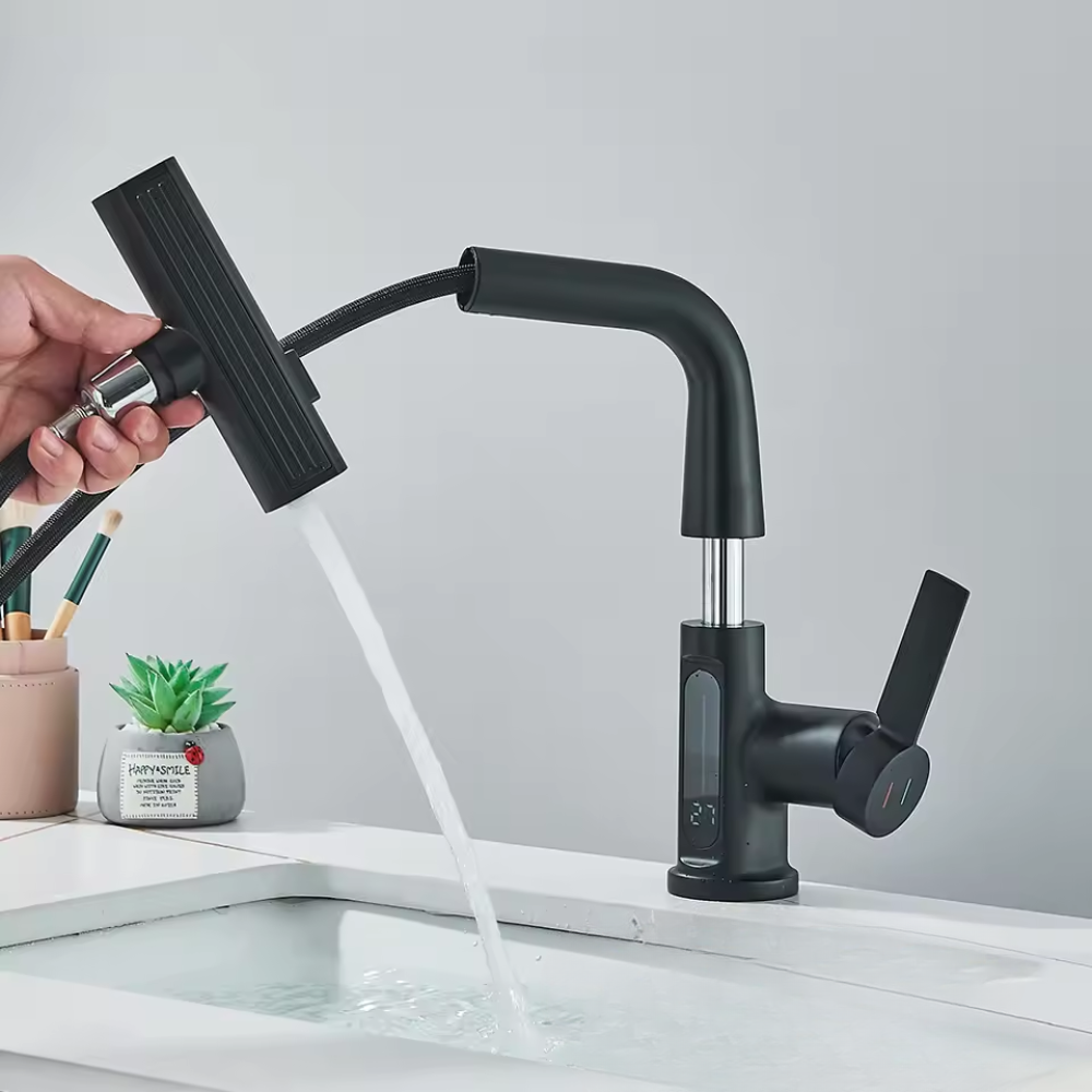 Deze watervalkraan met digitaal temperatuurdisplay brengt comfort, veiligheid en design samen in één slimme oplossing. De kraan is voorzien van een uittrekbare tuit en biedt een zachte watervalstraal, perfect voor dagelijks gebruik. Dankzij de digitale temperatuurweergave zie je direct hoe warm het water is – ideaal voor een veilige en moderne badkamerbeleving.