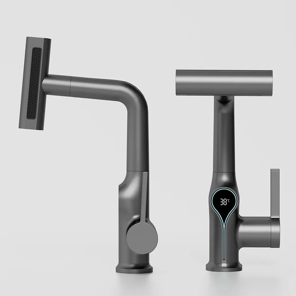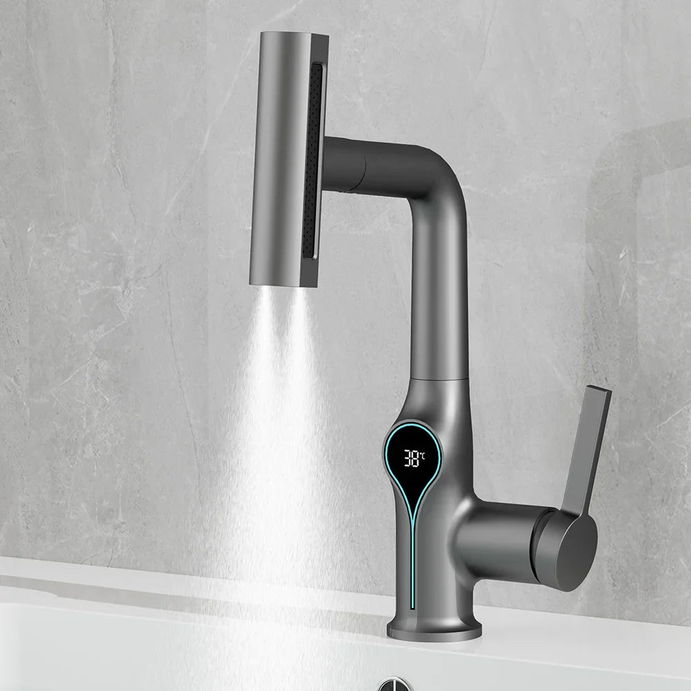 Deze wastafelkraan met digitale temperatuurweergave en watervalstraal biedt comfort, veiligheid en een moderne uitstraling in één. De verstelbare sproeikop maakt het wassen van handen, gezicht of kleine voorwerpen extra handig, terwijl de temperatuurweergave direct inzicht geeft in de watertemperatuur. Geschikt voor warm en koud water, perfect voor een eigentijdse badkamer.