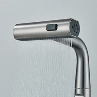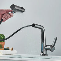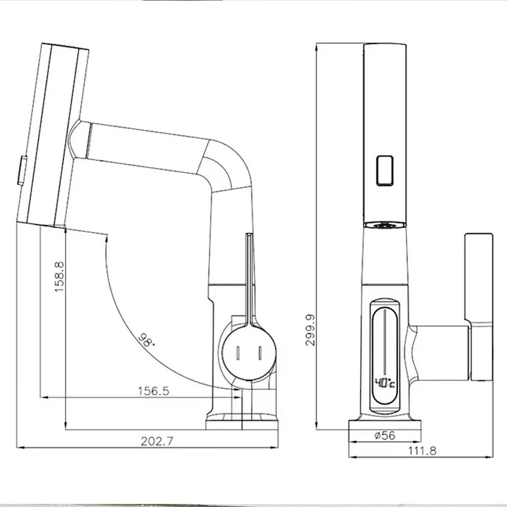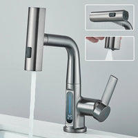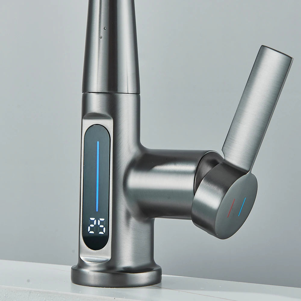 Deze wastafelkraan met watervalstraal en digitale temperatuurweergave combineert gebruiksgemak met eigentijds design. De beweegbare sproeier maakt het wassen van handen, gezicht of kleine objecten extra comfortabel, terwijl je met één blik ziet hoe warm of koud het water is. Perfect voor wie houdt van praktische luxe en een moderne uitstraling in de badkamer.