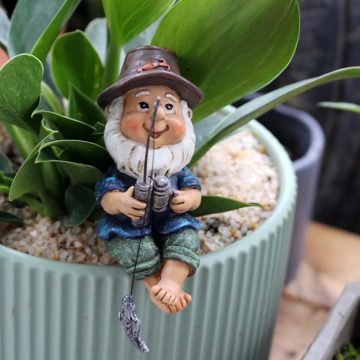 Dit vissende kabouter beeldje van hars is een speelse en charmante decoratie voor je bureau, tafel of woonkamer. Het miniatuur design met hengel voegt een vleugje humor toe en maakt het een originele blikvanger in elke ruimte. Dankzij het compacte formaat is dit ornament eenvoudig te plaatsen en ideaal als cadeau voor liefhebbers van kabouters en unieke decoratie.