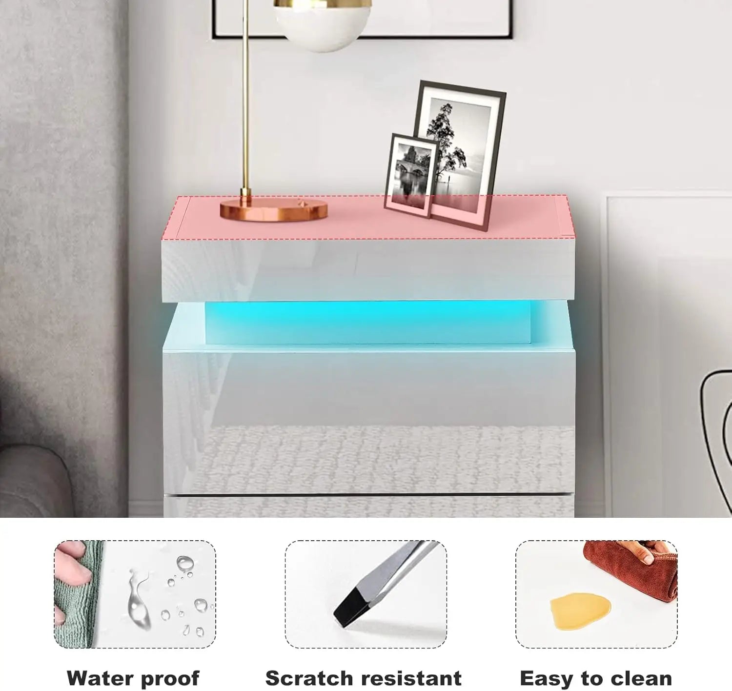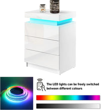 De Velmira is een elegant wit nachtkastje met hoogglans afwerking aan vier zijden, voorzien van drie ruime lades en LED-verlichting. Perfect als stijlvolle en functionele aanvulling op de slaapkamer.
