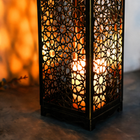 Deze decoratieve ijzeren kaarshouder met fijn arabesk motief verspreidt een warm lichtspel zodra je een kaars aansteekt. Dankzij de opengewerkte patronen ontstaan er sierlijke schaduwprojecties op muren en oppervlakken. Perfect als sfeermaker in woonkamers, op de eettafel of als rustgevend accent in de slaapkamer.