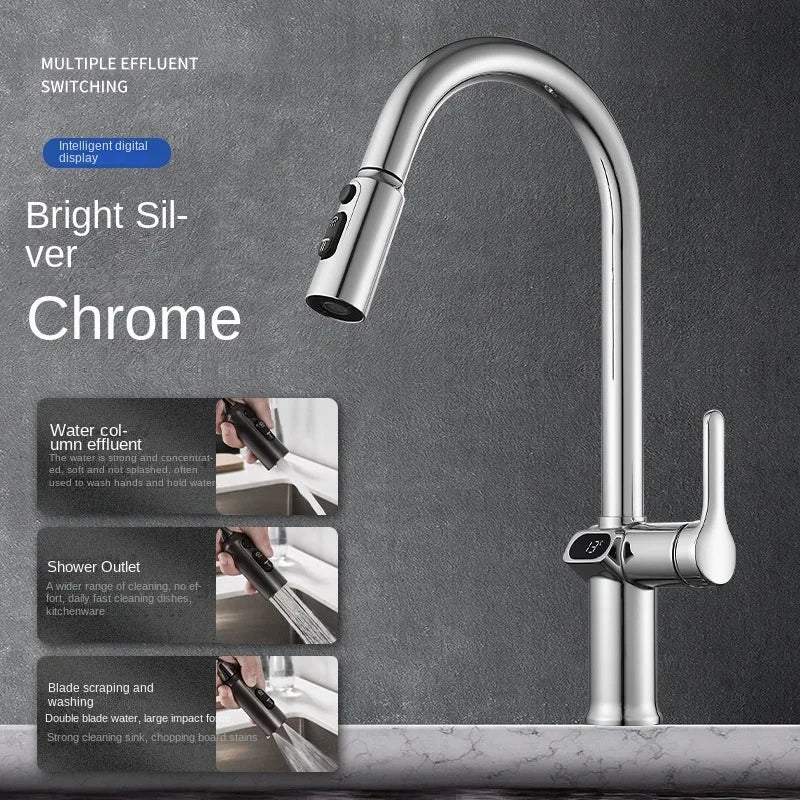 Acest robinet de bucătărie extensibil cu afișaj digital combină stilul, confortul și funcționalitatea. Gura rotativă facilitează accesul la mai multe chiuvete, în timp ce afișajul temperaturii asigură o utilizare sigură și precisă. Datorită capului de pulverizare extensibil, clătirea legumelor, vaselor și tigăilor devine mai rapidă și mai eficientă.